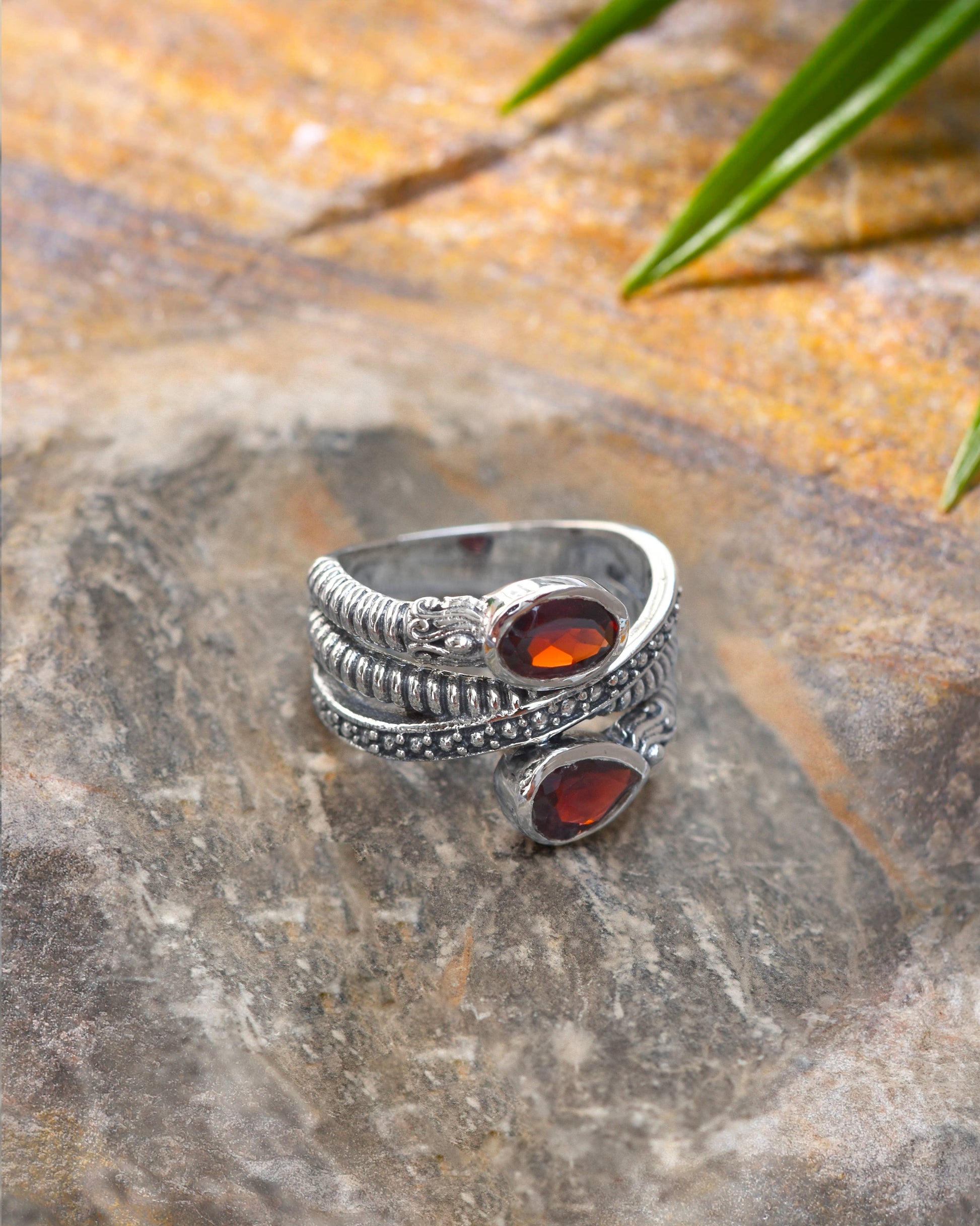 Handcrafted in genuine 925 sterling silver, this striking ring features a wrap-around design with natural, untreated garnet gemstones in pear and oval cuts. The deep red stones are accented by intricate silverwork, including delicate beaded detailing along the band. A stylized serpent-inspired motif frames the center, adding both texture and symbolism to the design. With its combination of smooth, raised silver and sculpted detailing, this ornate piece beautifully balances elegance with bold, artisanal charm.