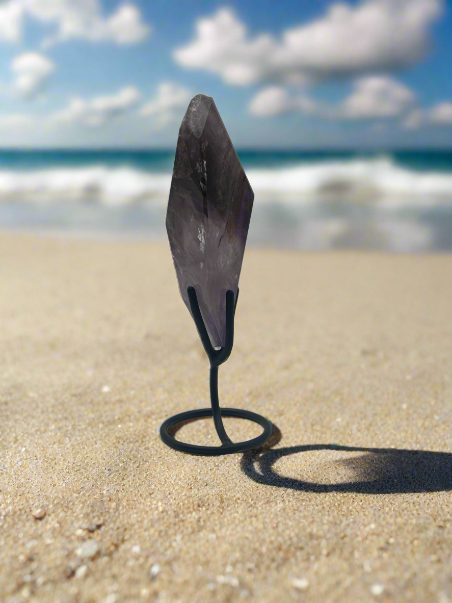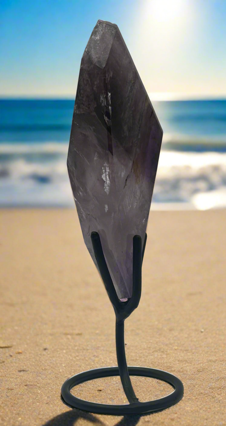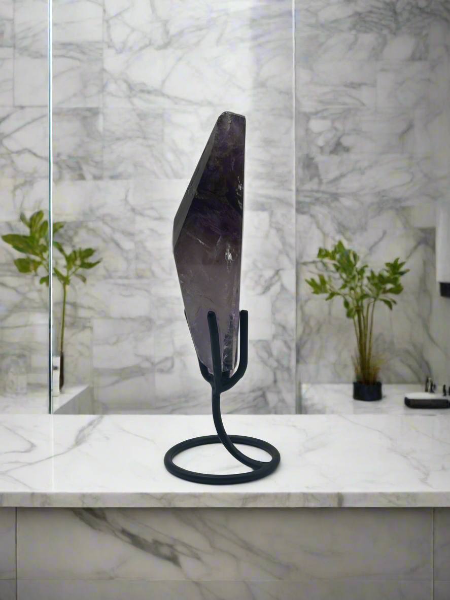 This amethyst freeform radiates beauty with its blend of deep violet and soft lavender tones, highlighted by subtle banding and natural inclusions. Expertly polished to a smooth, high-gloss finish, it feels as luxurious in the hand as it looks on display.