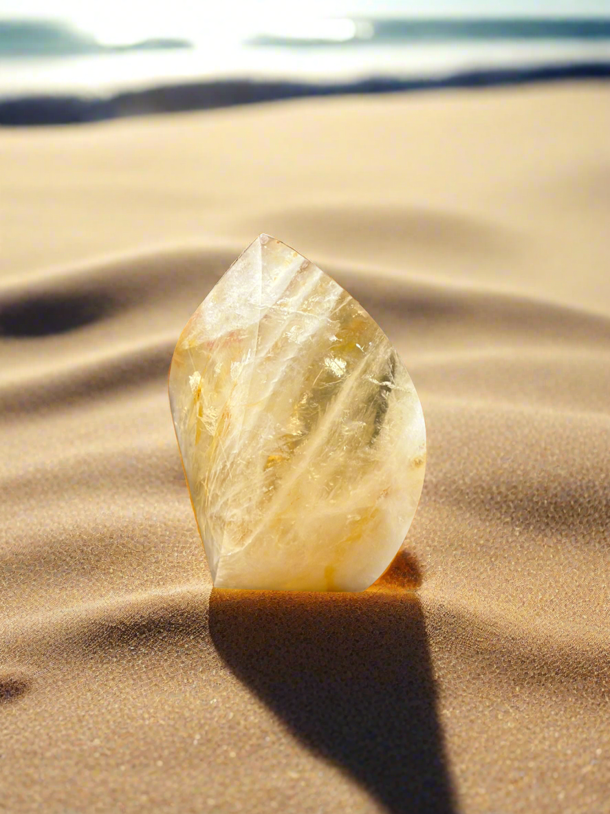 This beautifully carved flame showcases the radiant, golden tones of high-quality Golden Healer Quartz, celebrated for its warm, uplifting energy. Naturally colored by iron oxide inclusions, the crystal glows with rich honey-gold hues, enhanced by expert polishing that reveals delicate veils, and rainbows within.
