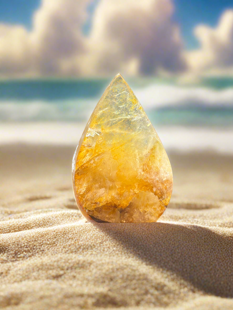 This expertly polished flame displays the vibrant, honey-gold hues of high-quality Golden Healer Quartz, a crystal prized for its warm, uplifting energy. The golden coloration is naturally formed from iron oxide inclusions, creating a radiant glow enhanced by delicate veils and occasional rainbow flashes.