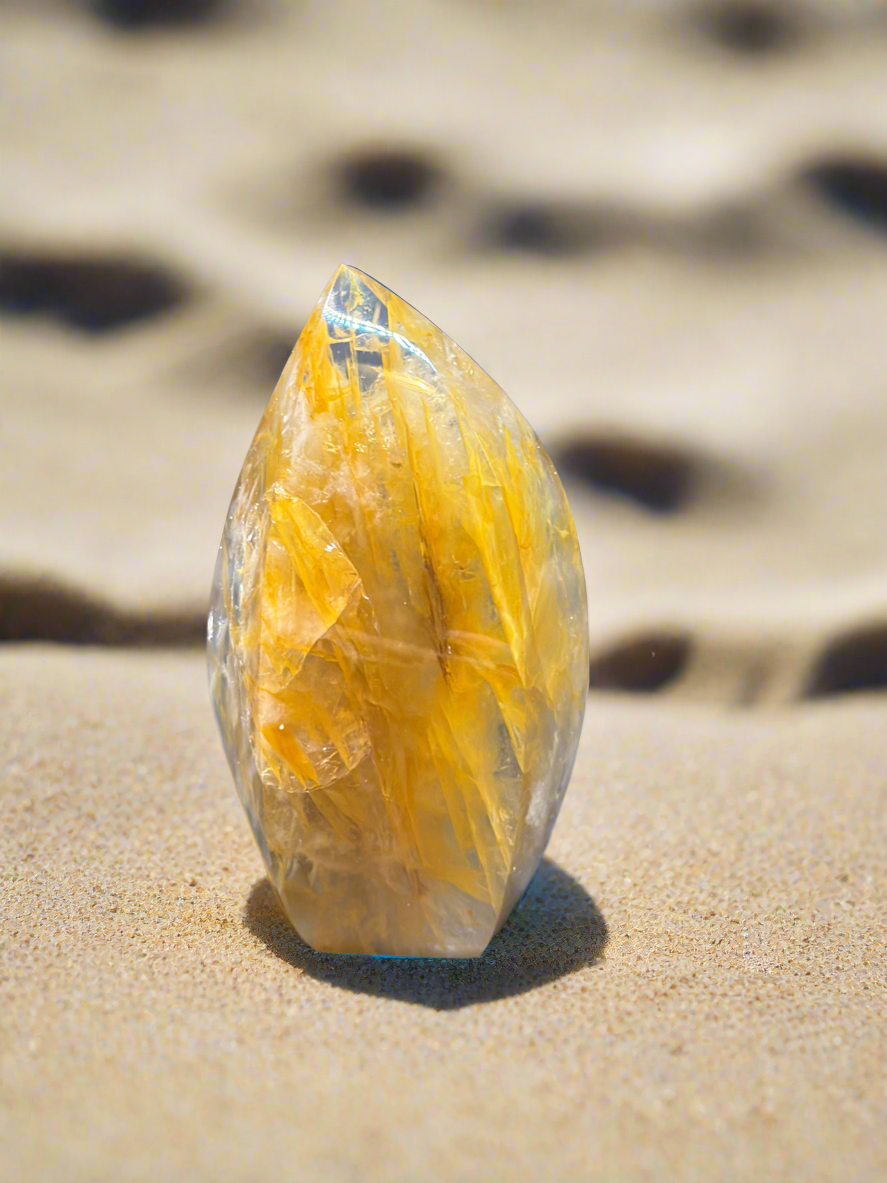 This beautifully polished flame showcases the luminous golden tones of high-quality Golden Healer Quartz giving it a pure, clean appearance. The warm honey-gold hue is naturally formed by iron oxide within the quartz, creating a soft, glowing effect that radiates uplifting energy.