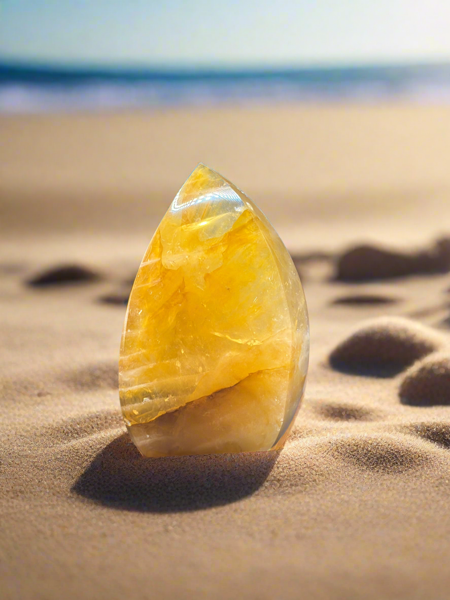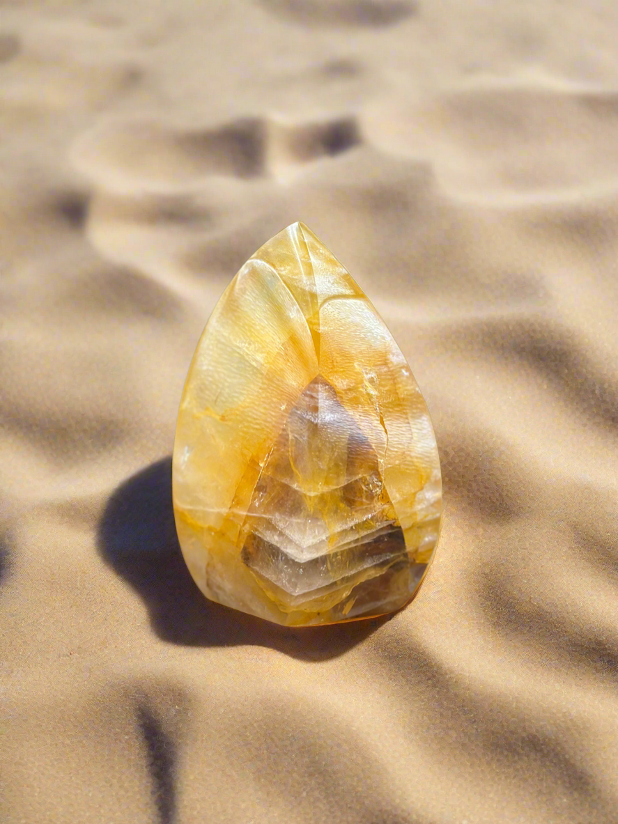 This stunning flame-shaped carving radiates the warm, golden glow of premium Golden Healer Quartz, a crystal celebrated for its uplifting and restorative properties. The golden tones are naturally created by iron oxide inclusions, producing a rich honey hue that glows in the light.