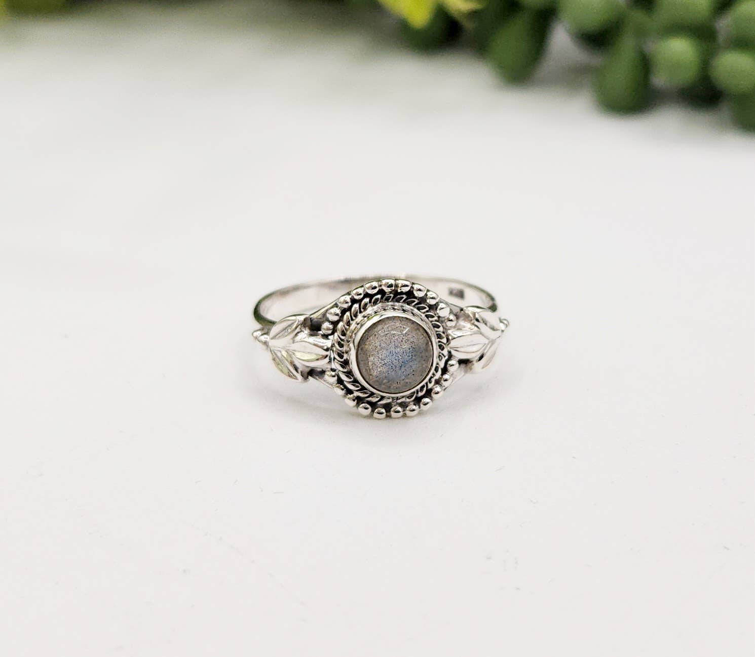 Two graceful silver leaves hug a glowing round Labradorite, creating a ring that feels both mystical and timeless. Known for its flashes of iridescent color, Labradorite is a stone of transformation, intuition, and protection—perfect for those walking a spiritual path or seeking inner strength.