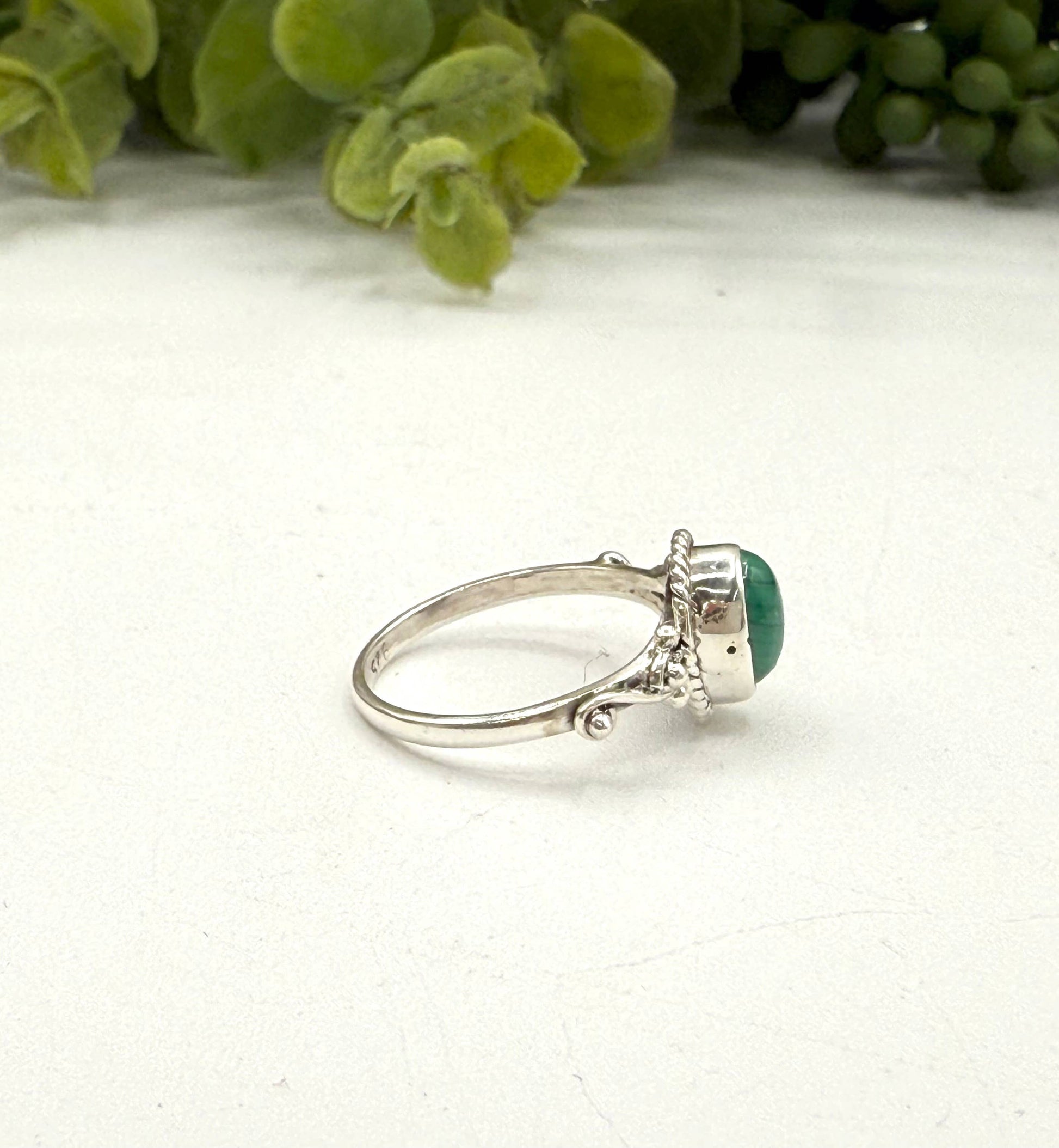 Two graceful sterling silver swirls rise from the band to cradle a vivid round Malachite (approx. 8mm). Known for its rich green bands and protective energy, Malachite makes this design both elegant and empowering. The flowing silverwork highlights the stone’s natural beauty, creating a timeless piece to treasure.