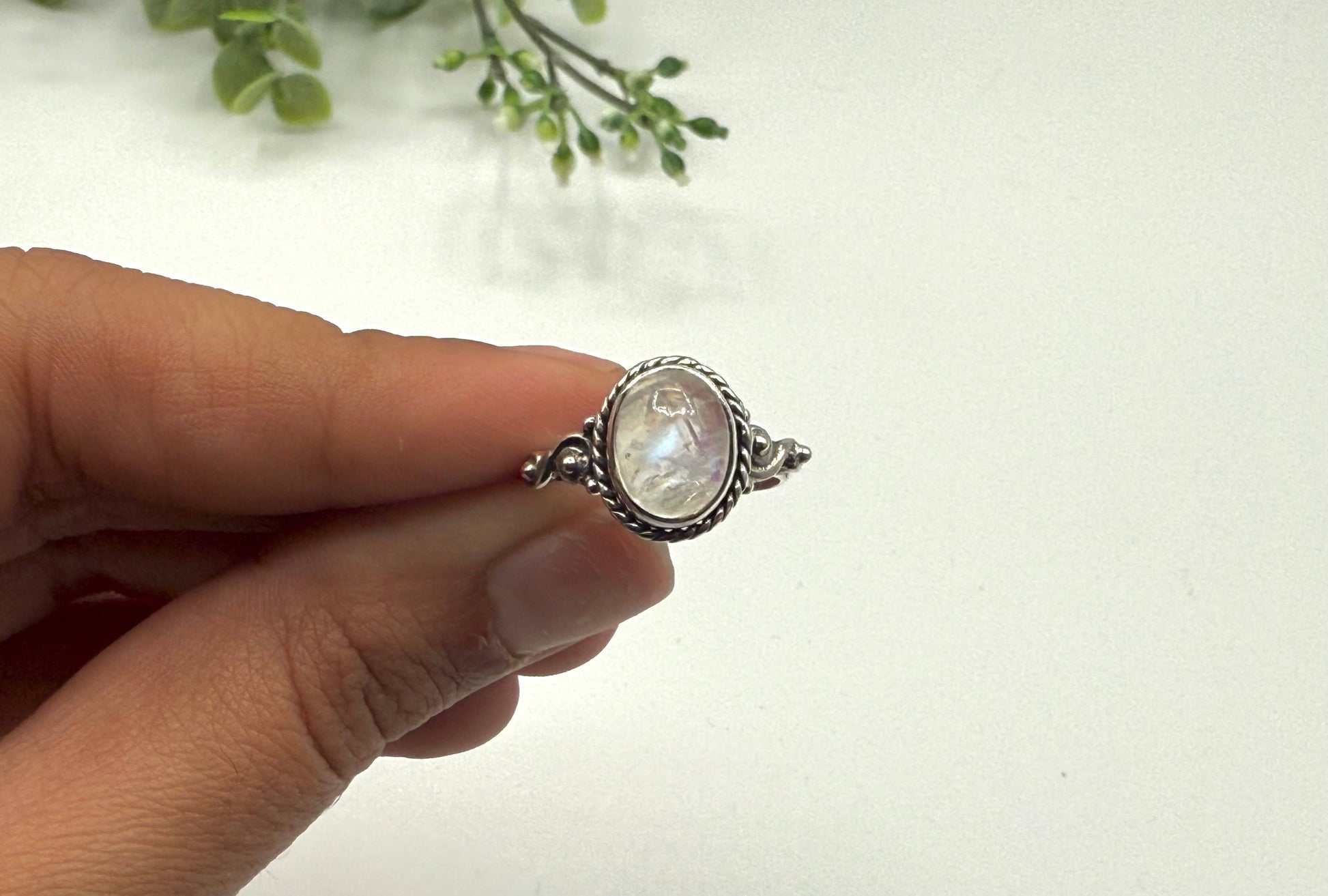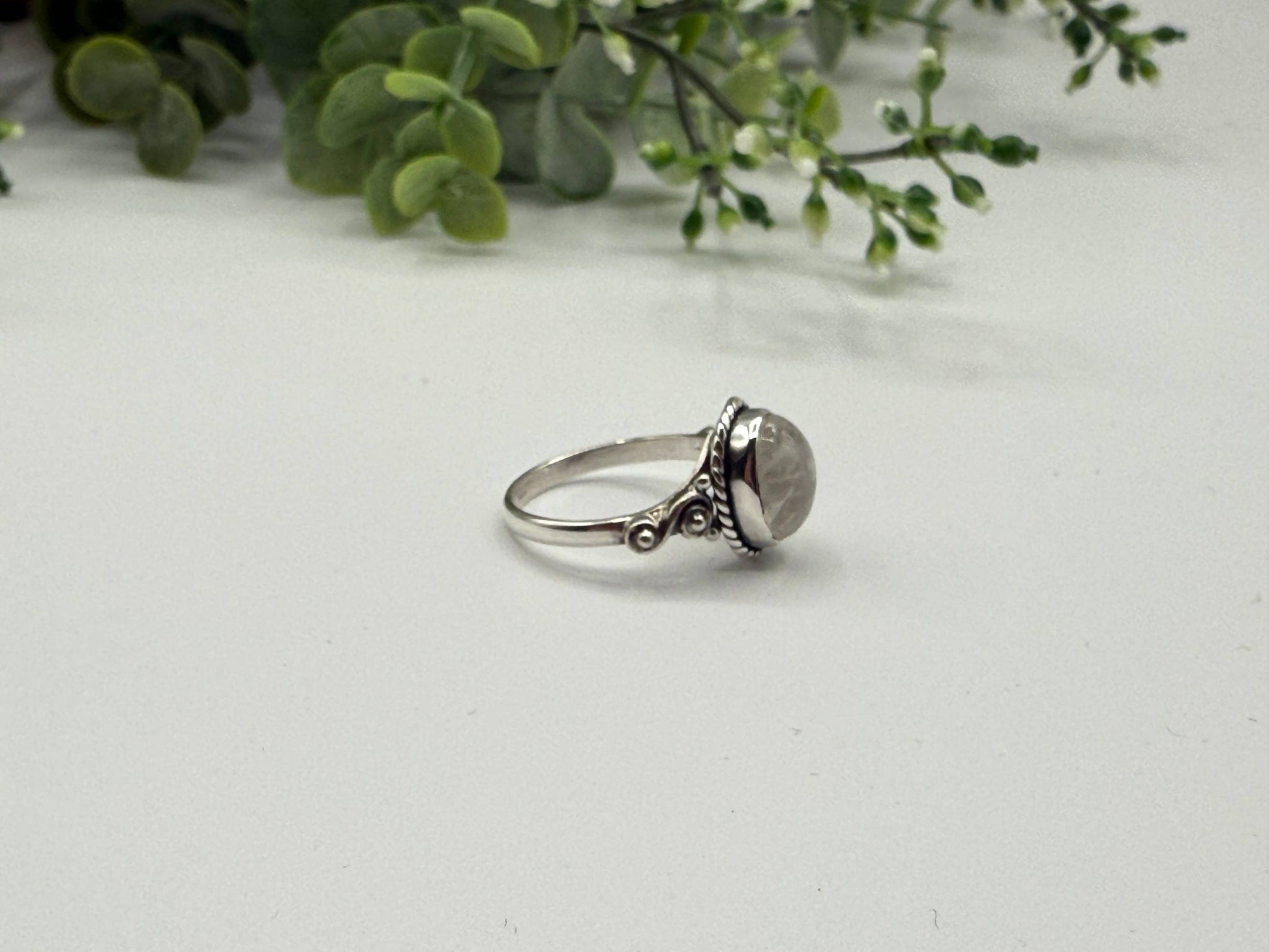 Two graceful sterling silver swirls rise from the band to cradle a glowing round Rainbow Moonstone (approx. 8mm). Known for its soft shimmer and flashes of iridescent light, Rainbow Moonstone is often called the “Stone of New Beginnings.” It’s cherished for its calming, intuitive energy and connection to the divine feminine.
